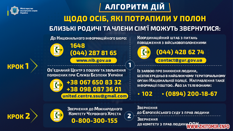 «По-перше, для отримання або надання інформації громадяни можуть звернутися до Об’єднаного Центру з пошуку та звільнення полонених при Службі безпеки України. Це можна зробити за телефонами +38 067 650 83 32, +38 098 087 36 01 або надіславши запит на електронну пошту united.centre.ssu@gmail.com», – йдеться у повідомленні.