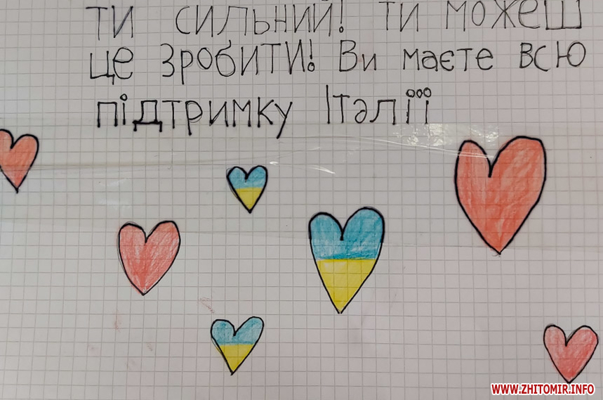 А у Волонтерському штабі Житомира показують листи дітей, які живуть за кордоном, проте родом з України, і вони теж переживають за свою батьківщину. Волонтери кажуть, що діти знають, що росія напала на Україну, і скидає бомби на мирних людей, нищить житлові будинки та цивільні об'єкти і будучи на чужині, і дорослі, і маленькі українці, розказують світові правду про цю війну.