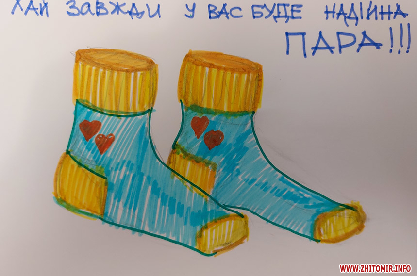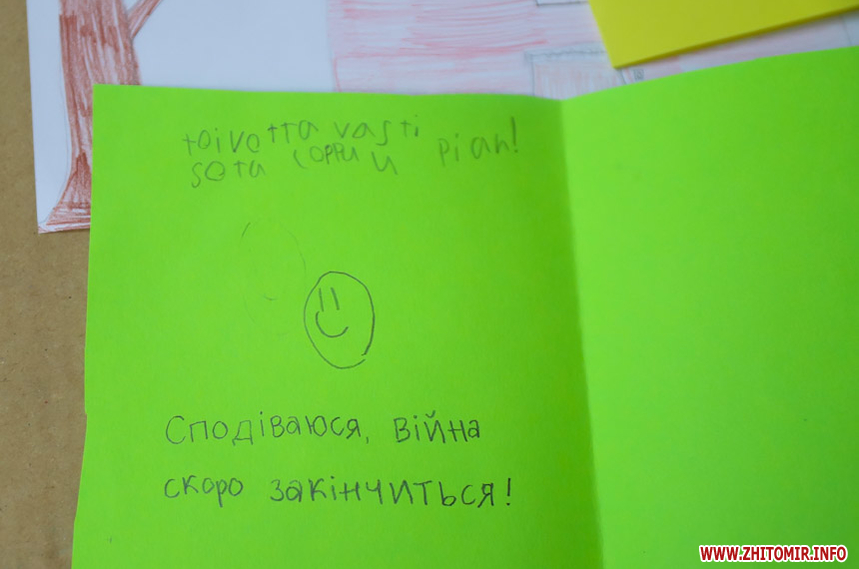 Дитячі листи та малюнки збирають усі житомирські волонтери і вкладають у посилки військовим. Кажуть, що ці листи допомагають бійцям триматися. Такі листи у волонтерів не затримуються надовго, проте ця дитяча творчість є дуже цінною не лише для військових. Листи та малюнки дітей відображають їх розуміння ситуації, віру в ЗСУ, мирне щасливе майбутнє. Тому ми вирішили збирати та зберігати у фоторепортажах дитячі листи на фронт як історичне свідчення для наших нащадків.