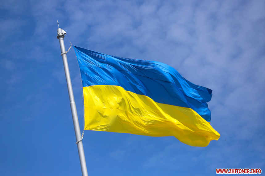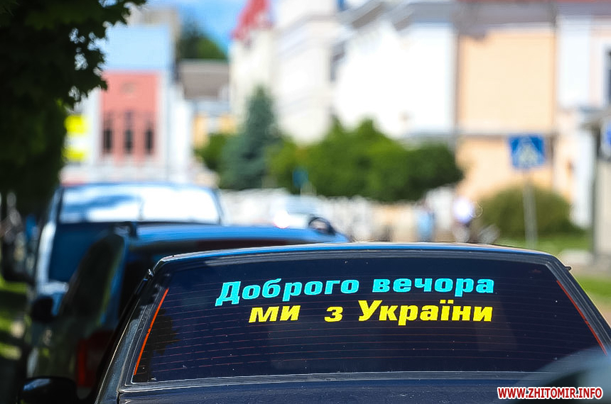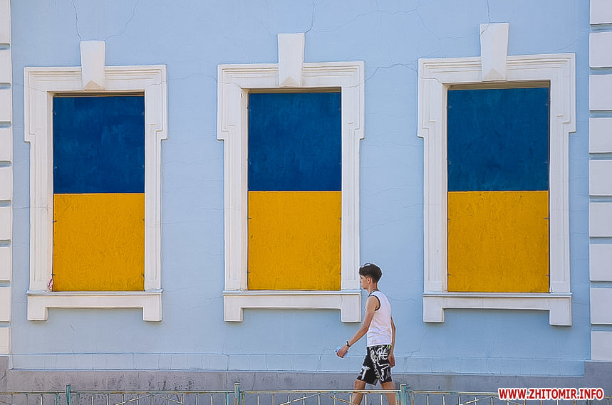 Державні прапори у Житомирі можна побачити не лише на державних установах – навіть на стовпах, приватних машинах, кав'ярнях, сходах люди вивішують синьо-жовті прапори.