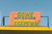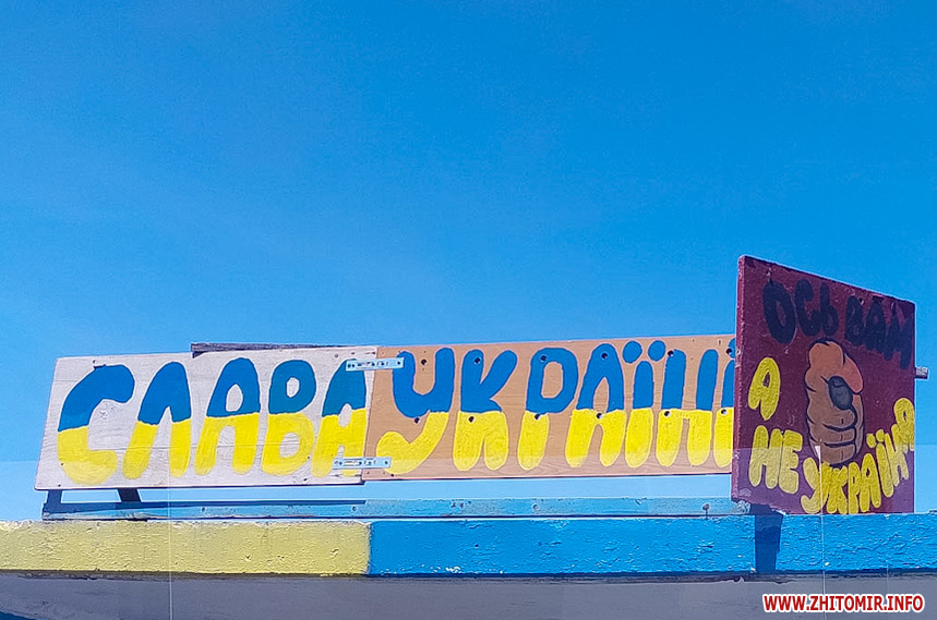 На зупинках в околицях досі зняті таблички з назвами сіл та міст, проте винахідливі люди змінили їх патріотичними фразами.