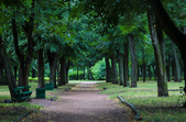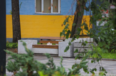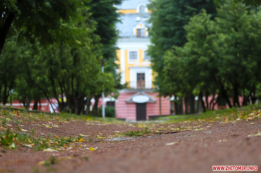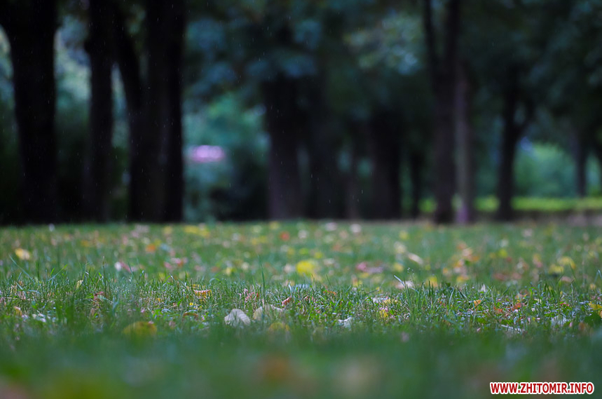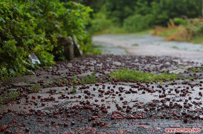 Хоча ще тільки середина літа, доріжки вже встелені жовтим опалим листям, що створює атмосферу ранньої осені. У дворах дощ “змив” з дерев незібрані вишні, вкривши асфальт.