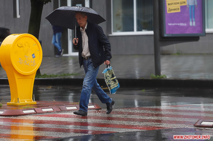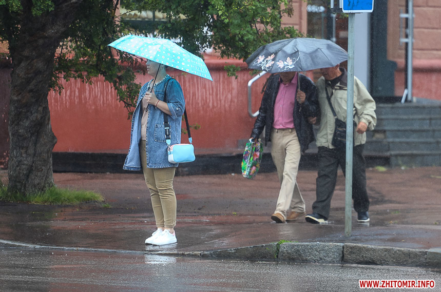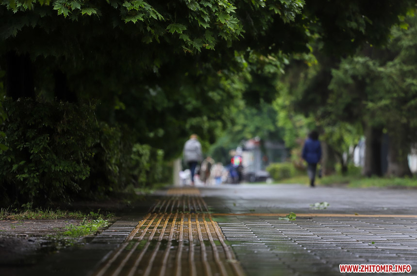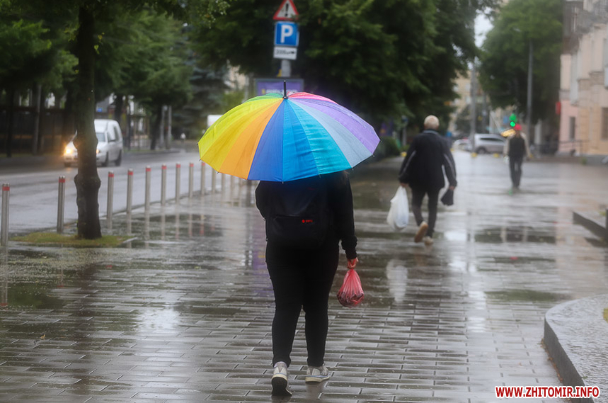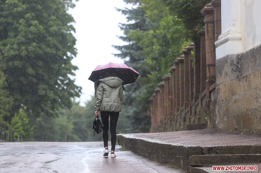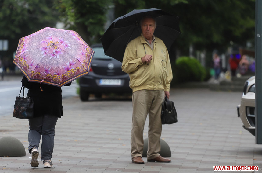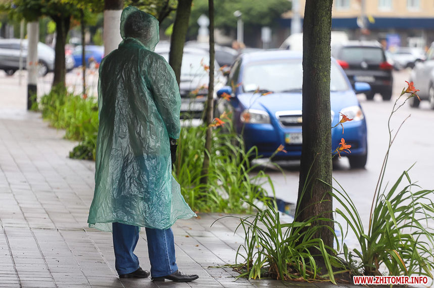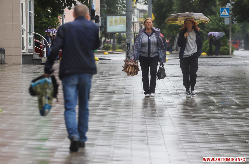 Як і прогнозували синоптики, 13 липня у Житомирі хмарна дощова погода. Впродовж дня стовпчик термометра тримається на непритаманних для середини літа 13 градусах тепла. Періодично йде дощ, тож більшість містян дістали парасольки та теплі, подекуди навіть зимові, куртки. Але є і відчайдухи, які все ж гуляють під дощем у легкому одязі.
