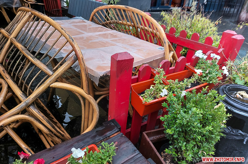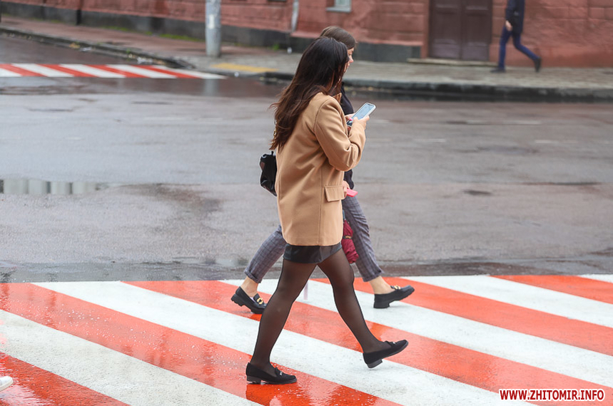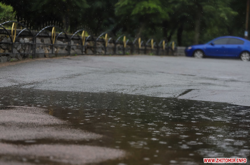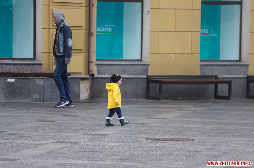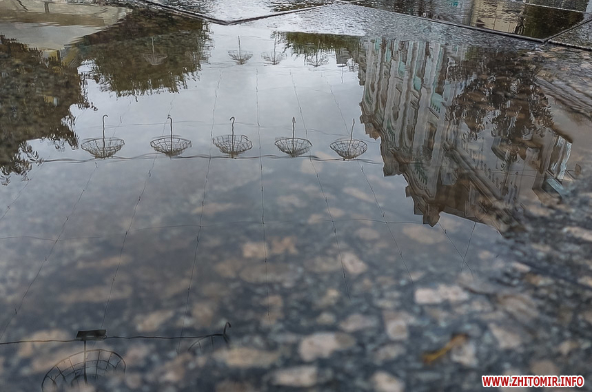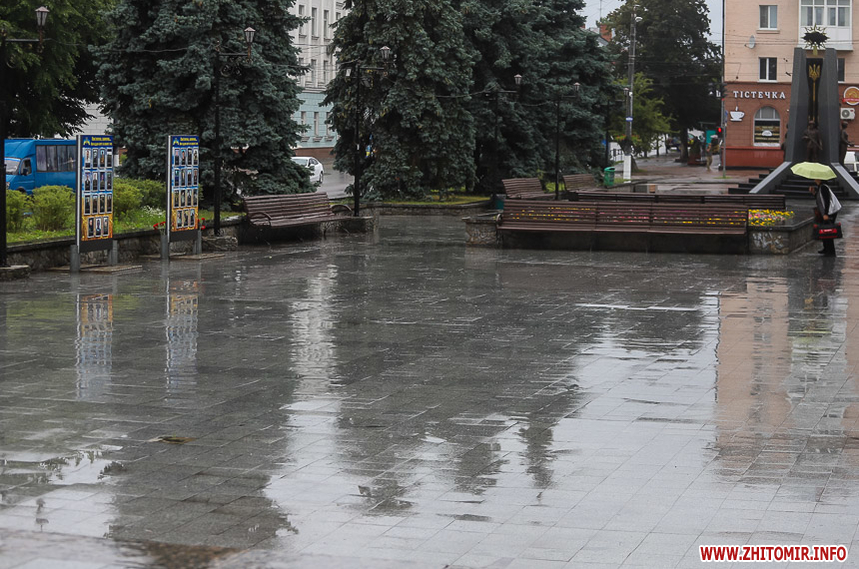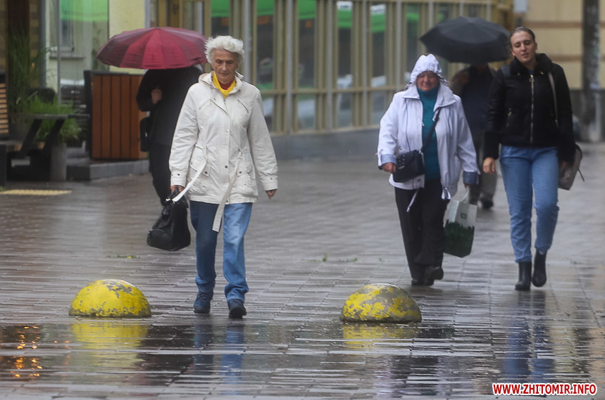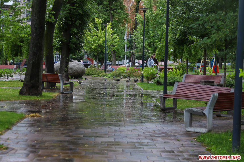 Як і прогнозували синоптики, 13 липня у Житомирі хмарна дощова погода. Впродовж дня стовпчик термометра тримається на непритаманних для середини літа 13 градусах тепла. Періодично йде дощ, тож більшість містян дістали парасольки та теплі, подекуди навіть зимові, куртки. Але є і відчайдухи, які все ж гуляють під дощем у легкому одязі.