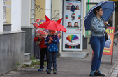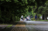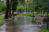 Лавки у парках та скверах спорожніли, проте і дорослі, і діти не втрачають можливості прогулятися, коли дощ вщухає. Похмурий день містяни розбавляють яскравими парасольками та елементами одягу.