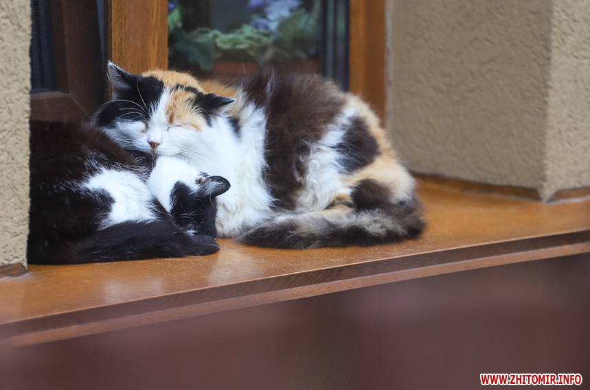 Міські тварини поховалися у сухі та затишні куточки - так, на підвіконнях будинків під прихистком сплять коти, не зважаючи на дощ та холод.