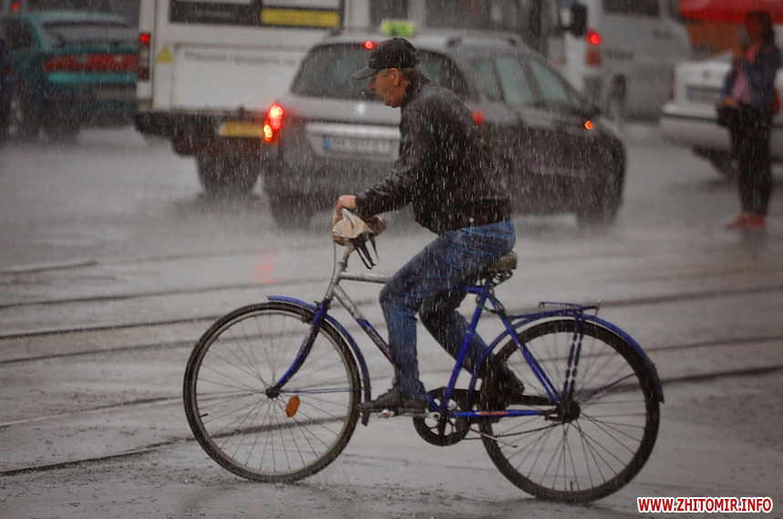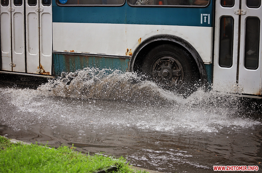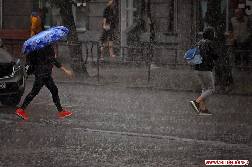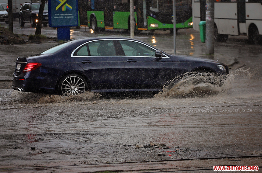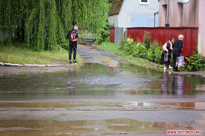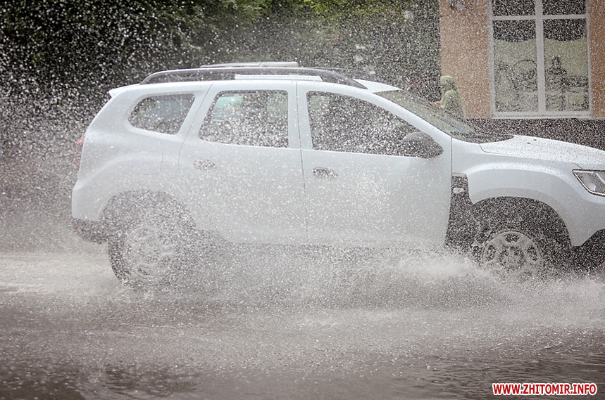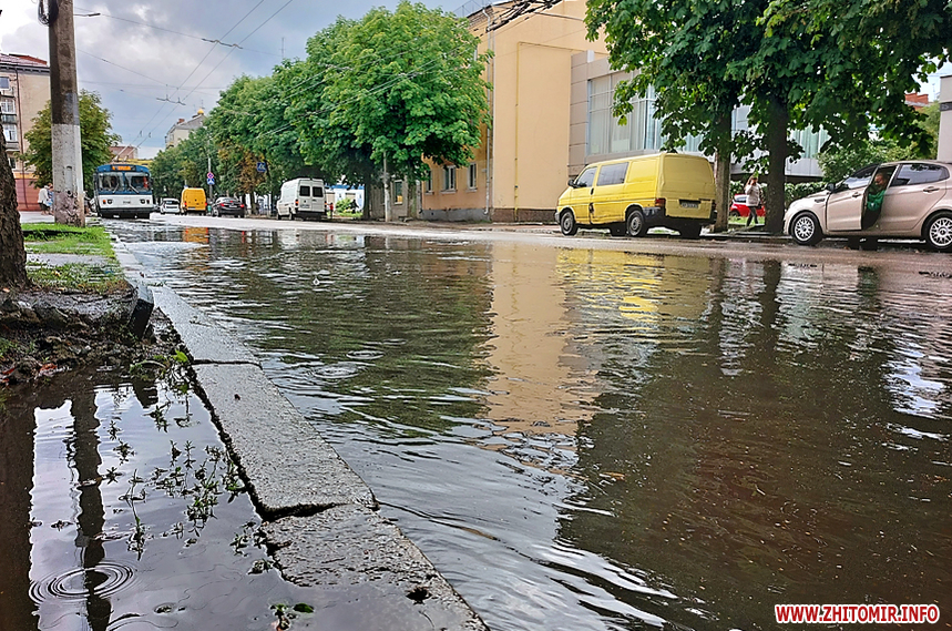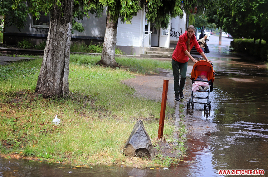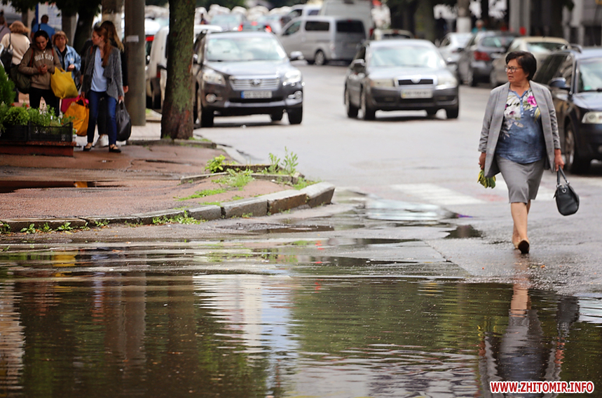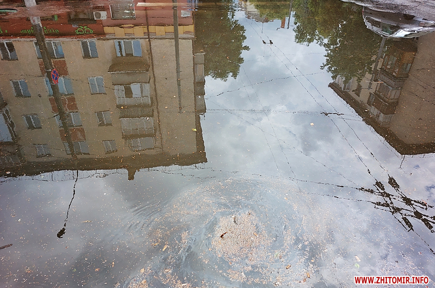 Неочікуваний для більшості містян короткочасний дощ в обідню пору за пів години тимчасово перетворив Житомир на плавуче та стрибуче місто.