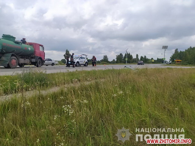 «Попередньо відомо, що близько 12:20 на ділянці автодороги Київ – Ковель – Ягодин, У Коростенському районі поблизу с. Пиріжків, водій автомобіля «Volkswagen Passat», 27-річний житель Рівненщини, не врахував дорожньої обстановки та скоїв зіткнення із бензовозом МАЗ, який рухався у попутному з ним напрямку під керуванням 61-річного жителя Олевщини. Внаслідок дорожньо-транспортної пригоди тілесні ушкодження отримали водій легковика та його 31-річний пасажир, теж рівненчанин. Обох чоловіків доставили до медичного закладу для надання необхідної допомоги», - йдеться у повідомленні.