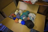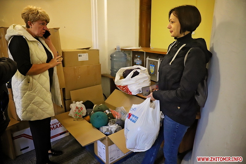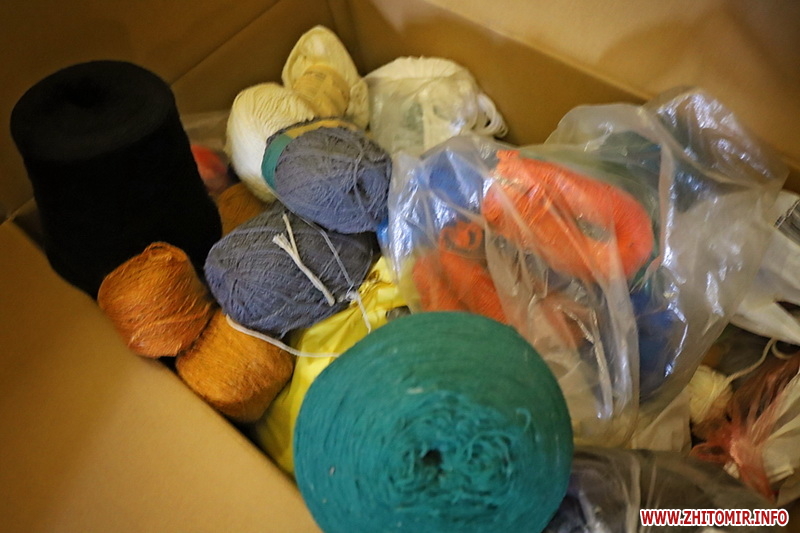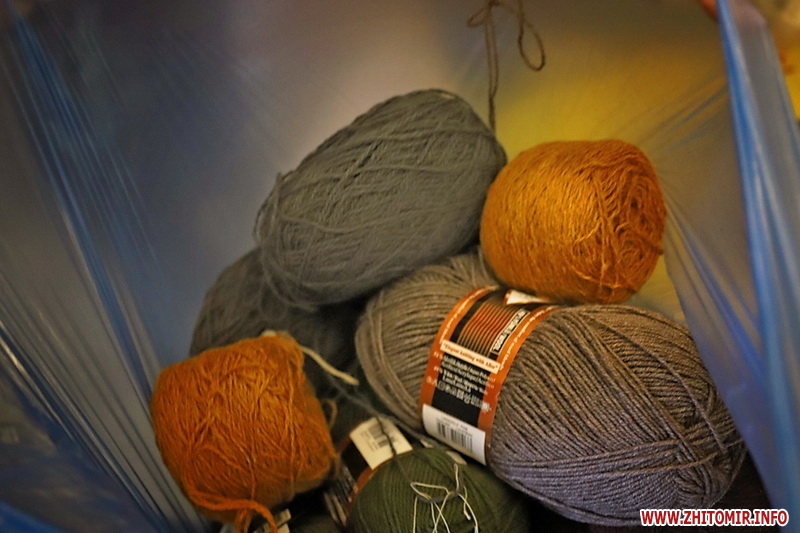 У холі Житомирської міської ради сьогодні величезна коробка та пакети з нитками: жовті, червоні, сині, марунові та зелені кольори, стара пряжа й сучасна нова вовна: великі і маленькі мотки. Її принесли небайдужі містяни для того, щоб майстрині могли сплести шкарпетки для наших захисників.