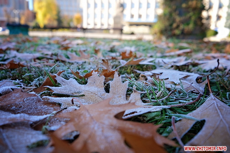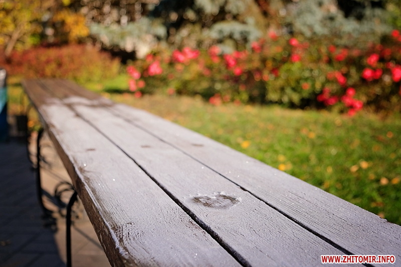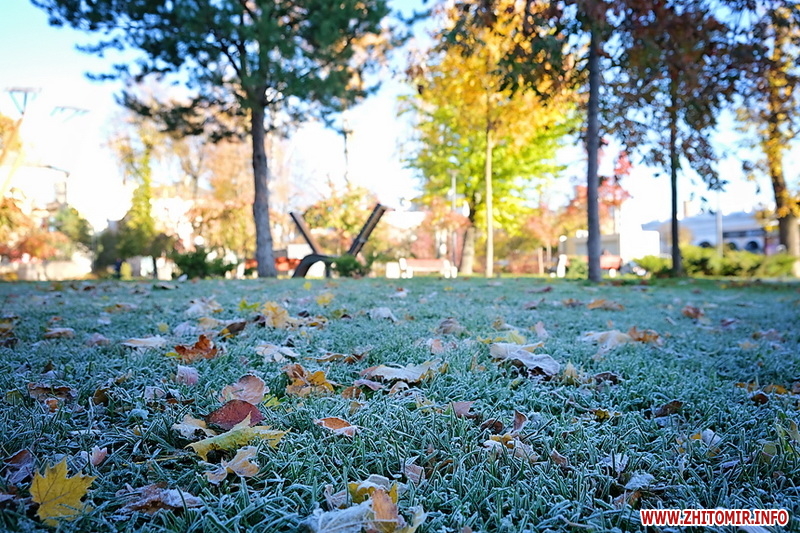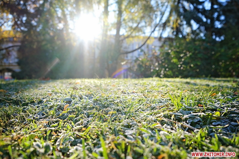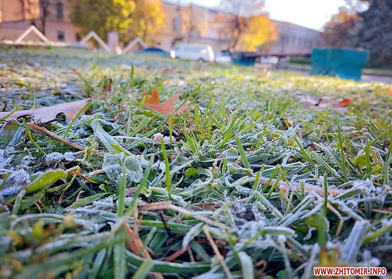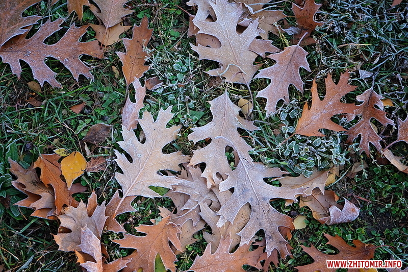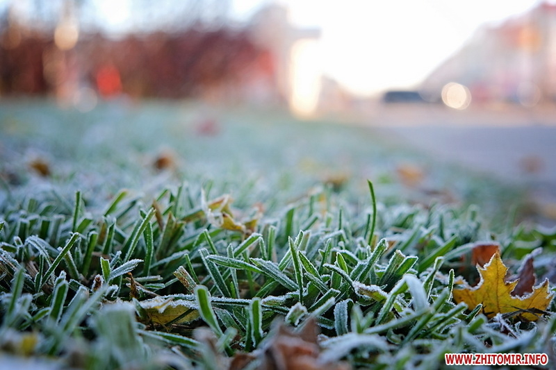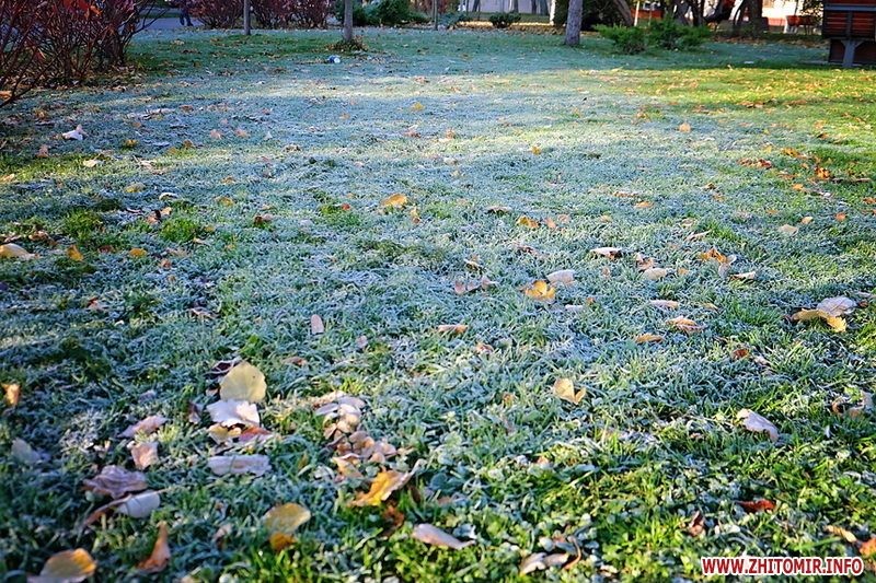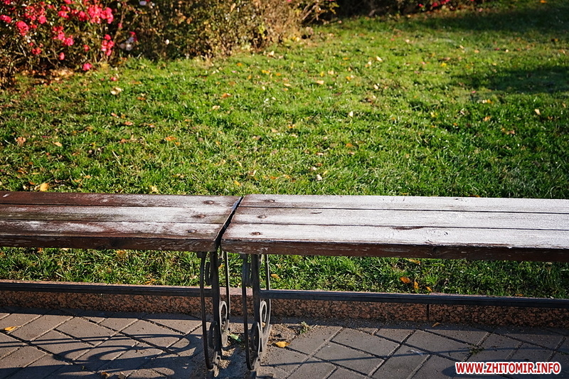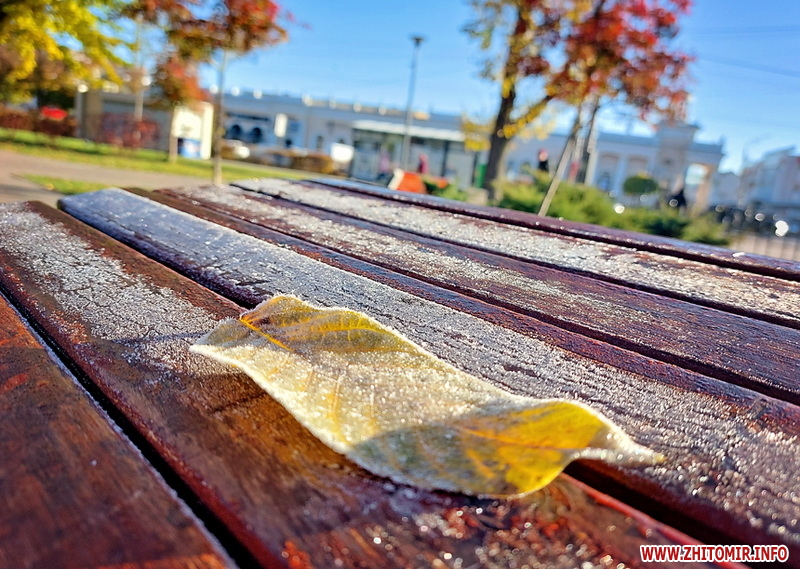 Вночі з 20 на 21 жовтня стовпчик термометра опустився нижче нуля, тож після нічних морозів лавки, трава та рослини на вулицях Житомира вкрили білі кристали паморозі.
