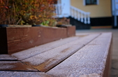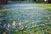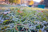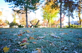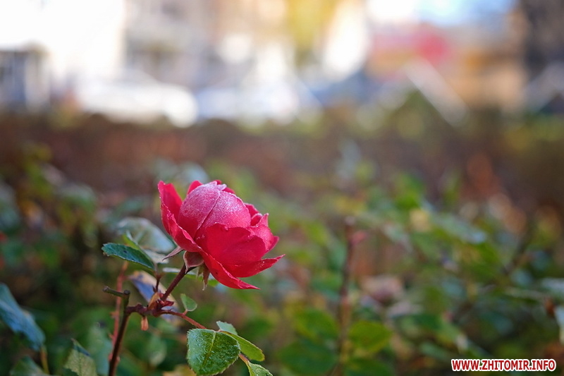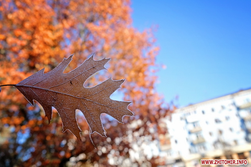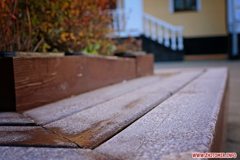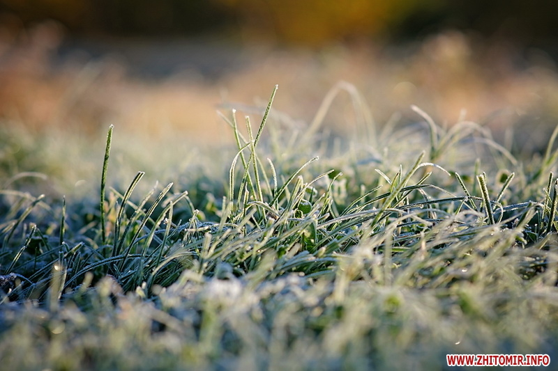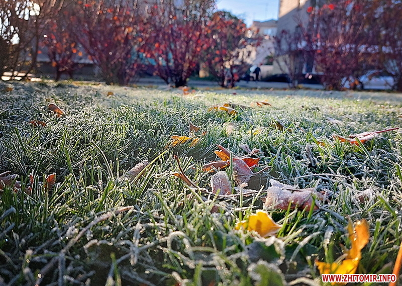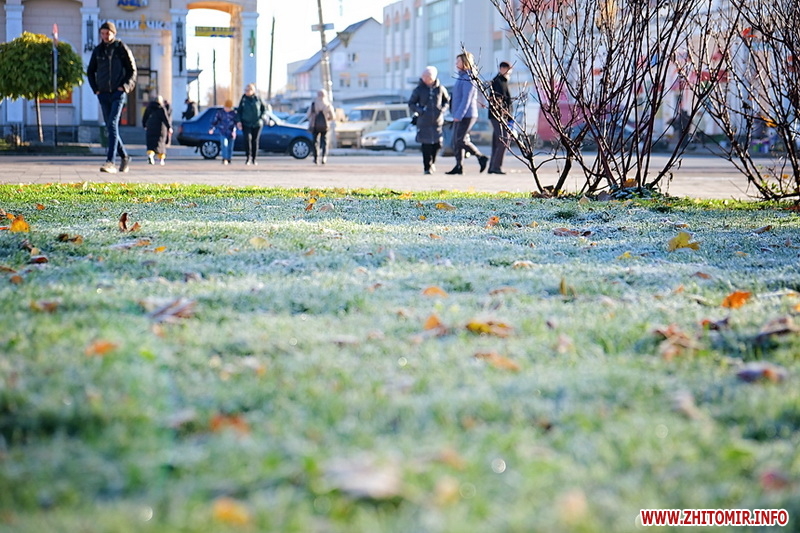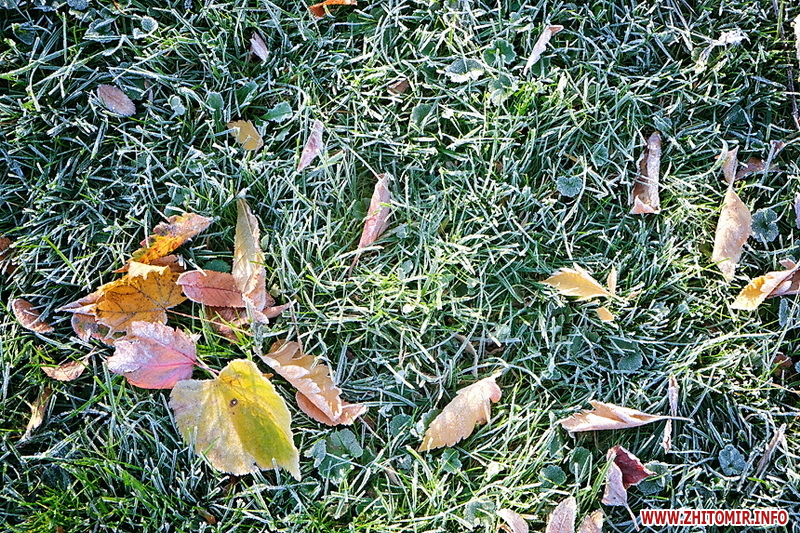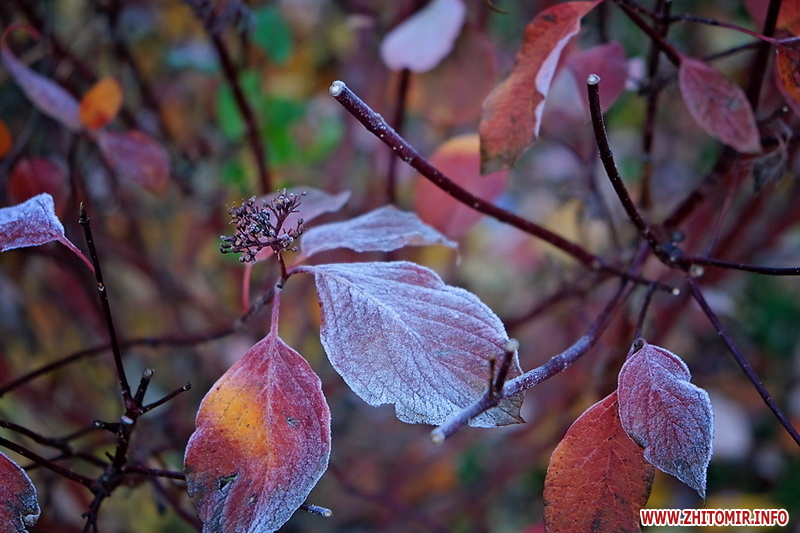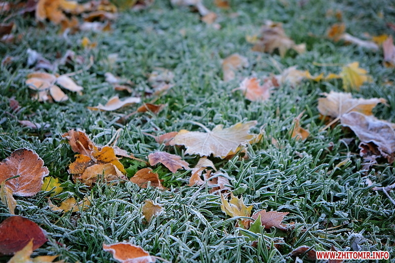 Вночі з 20 на 21 жовтня стовпчик термометра опустився нижче нуля, тож після нічних морозів лавки, трава та рослини на вулицях Житомира вкрили білі кристали паморозі.