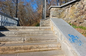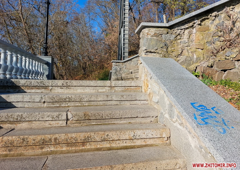 Один з плафонів ліхтарів, на якому закріплена камера, відсутній. Деякі сходини потріскалися, а одна навіть хитається.