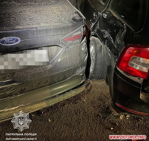 Уночі 21 грудня близько 23 години у Житомирі на Великій Бердичівській Daewoo на великій швидкості врізався в Skoda так, що її відкинуло на припаркований Ford, обійшлося без жертв.
