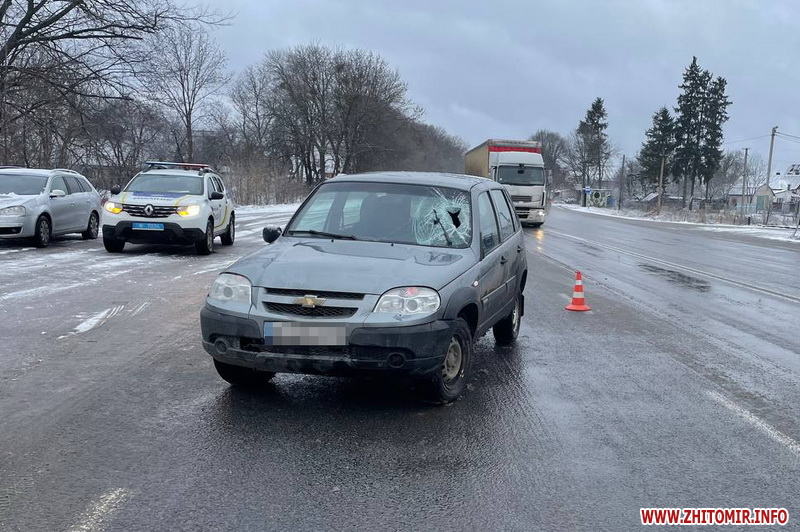 «Повідомлення про дорожньо-транспортну пригоду на автодорозі Житомир – Сквира, поблизу кафе, надійшло близько 8-ї години ранку. Попередньо, водій, 1996 року народження, керуючи автомобілем Chevrolet Niva, на нерегульованому пішохідному переході травмував жінку, 1991 року народження, і двох дітей, 2012 та 2014 років народження. Жінка доставлена до обласної лікарні, діти – до дитячої. Усім надається необхідна медична допомога. Нині триває встановлення всіх причин та обставин події», – розповіла речниця ГУНП Алла Ващенко.