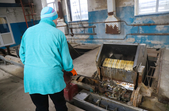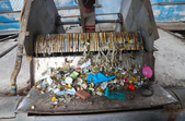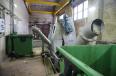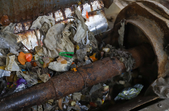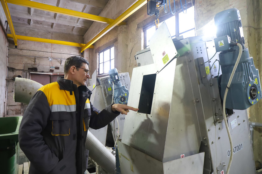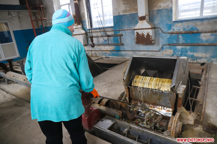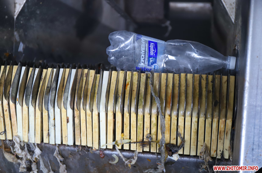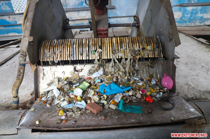 Те сміття, яке “проскочило” у труби в місті і не забило колодязі, потрапляє спочатку на головну каналізаційну насосну станцію. Тут спеціальне обладнання відфільтровує габаритне сміття та спресовує його у брекети. Переважно у цих брекетах різноманітні залишки тканини та ганчірки. За роботою обладнання стежать слюсарі.