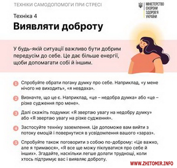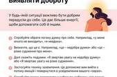 У будь-якій ситуації важливо бути добрим передусім до себе. Це дає більше енергії, щоби допомагати собі й іншим. Недобрі думки про себе можуть з’являтися у важкі часи – це нормально, утім не можна дозволяти їм травмувати вас. Тож важливо визначати такі думки і називати їх.