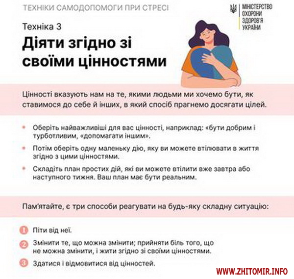 Цінності вказують нам на те, якими людьми ми хочемо бути, як ставимося до себе й інших, в який спосіб прагнемо досягати цілей. Зараз багато цілей можуть здаватися недосяжними, утім в наших силах продовжувати жити згідно з цінностями. Чому це важливо? Бо з цінностей витікають дії: те, що ми можемо робити і говорити щодня. Важливо приділяти увагу саме діям, адже це і є ваш спосіб впливу на світ навколо. Наприклад, ви не можете вплинути на те, що в країні триває війна, але в ваших силах перестати сваритися з людьми із вашої громади.