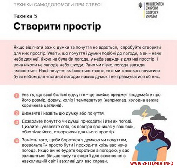 - Дозвольте почуттю чи думці приходити і йти як погоді. Дихайте і уявляйте собі, як повітря проникає у ваш біль, обволікає його, створюючи для нього простір.