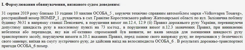 Дорожньо-транспортна пригода із загибеллю людини трапилася 31 серпня 2019 року в смт Гранітне Коростенського району. З матеріалів суду відомо, що обвинувачений, водій автомобіля Volkswagen Touareg, рухаючись селом, перевищив швидкість, виїхав на смугу зустрічного руху, де здійснив наїзд на велосипедиста. У результаті дорожньо-транспортної пригоди той помер.