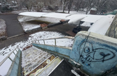 У Житомирі вдень 27 лютого волонтери обдирають стару облущену фарбу з літака у центральному міському парку.