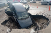 На вулиці Короленка у Житомирі автомобіль ВАЗ потрапив у величезну яму.