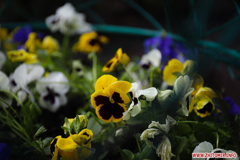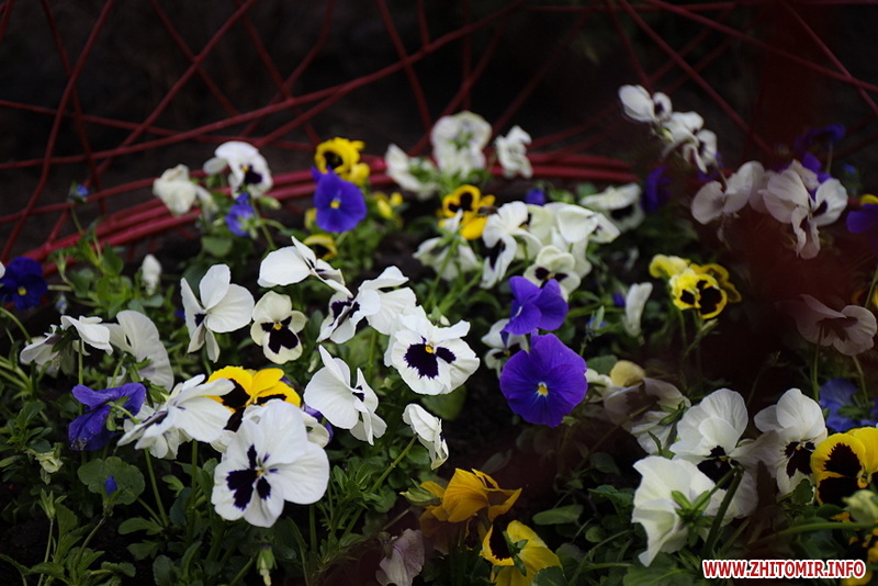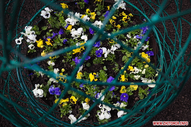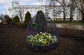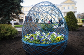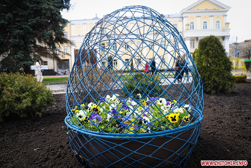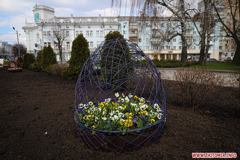 Також на центральній клумбі на майдані Корольова встановили декоративні металеві яйця з квітами віоли всередині.