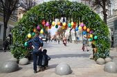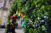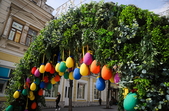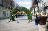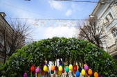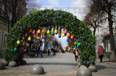 Так, на пішохідній Михайлівській встановили велику фотозону-арку, яка поєднує в собі різнобарвні писанки та штучну зелень.