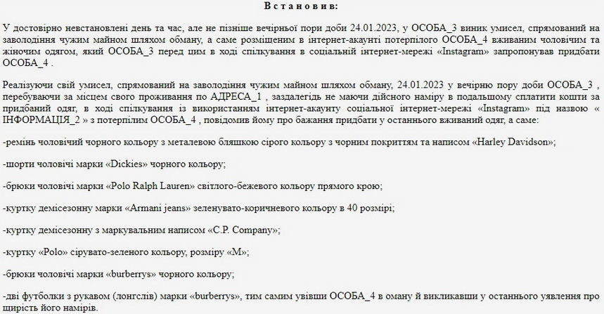 З матеріалів суду відомо, що одяг чоловік замовляв через Instagram. Ідеться про ремінь, шорти, штани, куртки, футболки.