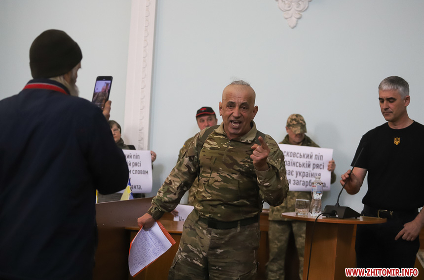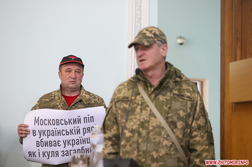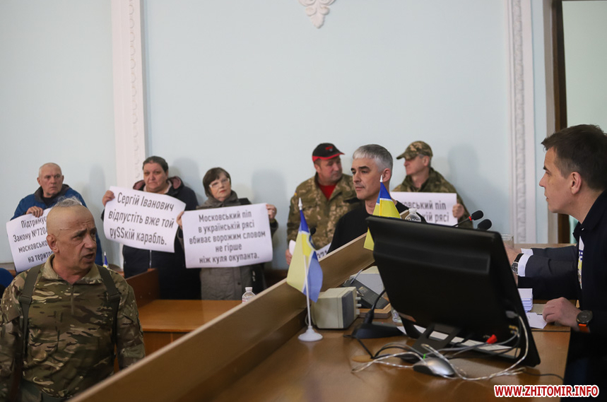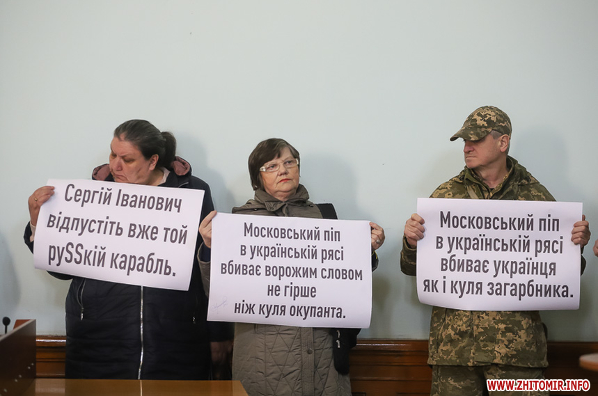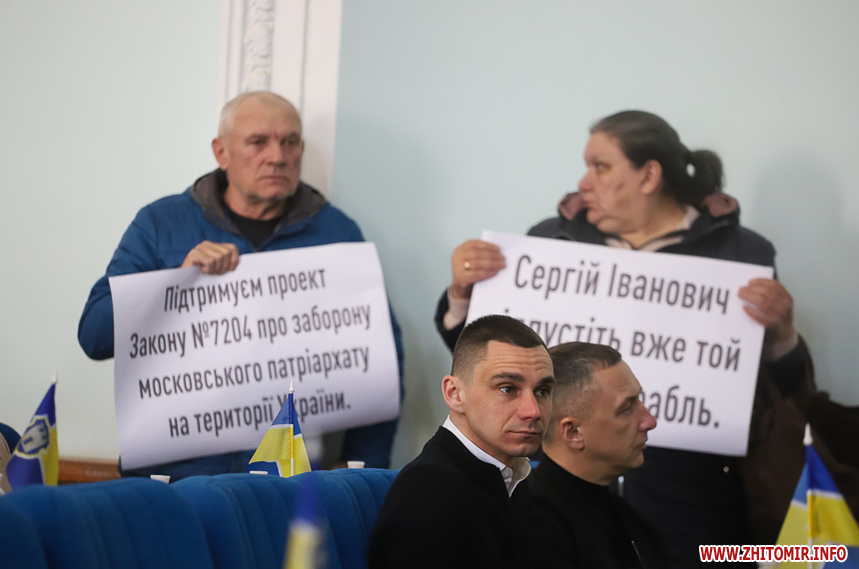 Нагадаємо, вранці 21 квітня біля будівлі Житомирської міської ради, де сьогодні проходить сесія, зібралося кілька містян з плакатами щодо заборони московського патріархату.