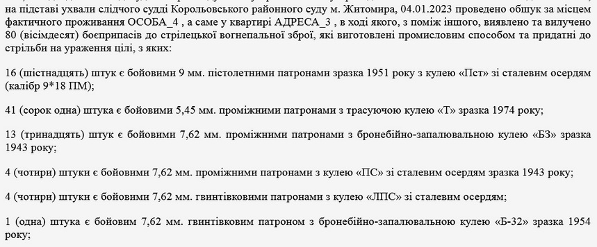 Зазначено, що вилучені у поліцейського набої, були зразка 1943-1974 років.