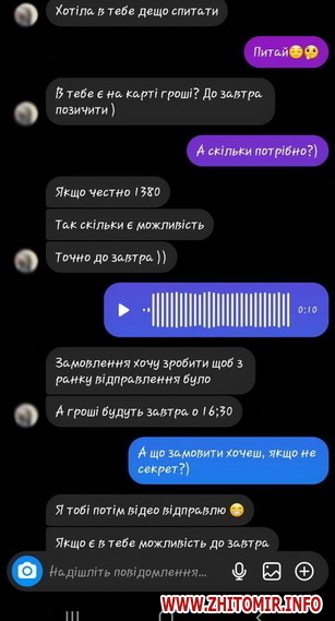 «Ми переписувалися в інстаграм, моя подруга теж недавно стала мамою і ми часто ділимося новим досвідом – материнством. Цього разу ми говорили про хрестини, вона запитала, чи готуємось ми до цієї події і я відповіла, що так. На цьому ми завершили листування, а вже через декілька годин вона попросила позичити їй гроші. Мене це насторожило, адже ми одночасно отримуємо фінансову допомогу по догляду за дитиною, тому я запитала, на що саме їй потрібні гроші. Вона відповіла загадково, мовляв – замовлю одну річ, а потім скину відео. Я повірила, адже ми, жінки, такі – любимо секрети», - розповіла потерпіла.