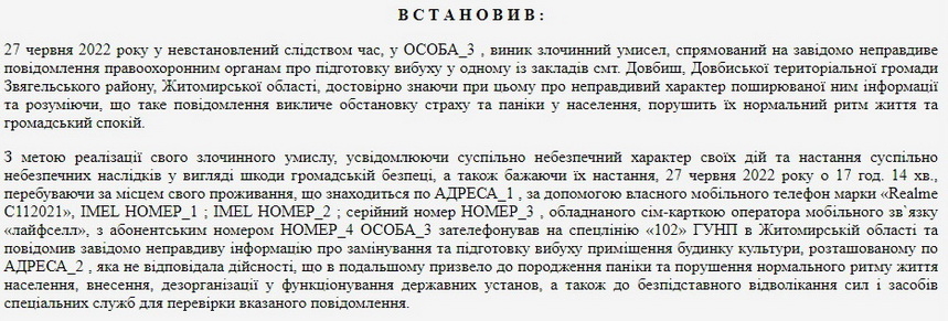 З матеріалів суду відомо, що «27 червня 2022 року у невстановлений слідством час у ОСОБА_3 виник злочинний умисел, спрямований на завідомо неправдиве повідомлення правоохоронним органам про підготовку вибуху у одному із закладів смт Довбиш (…), достовірно знаючи при цьому про неправдивий характер поширюваної ним інформації та розуміючи, що таке повідомлення викличе обстановку страху та паніки у населення, порушить їх нормальний ритм життя та громадський спокій».