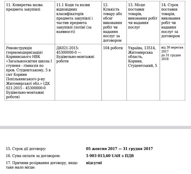 Житомир.info вдалося знайти тендер, про який згадує прокуратура – реконструкція (термомодернізація) Корнинського НВК «Загальноосвітня школа І ступеня - гімназія по пров. Студентському, 5 в смт Корнин Попільнянського р-ну Житомирської обл.».