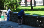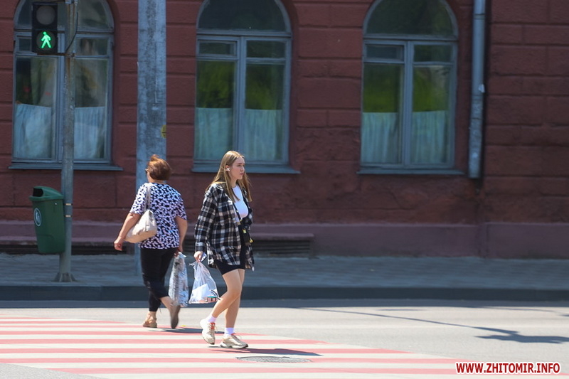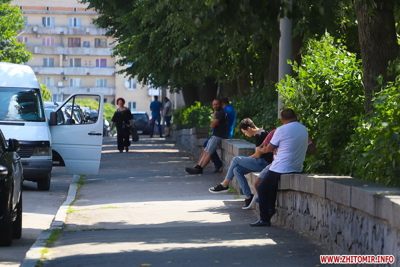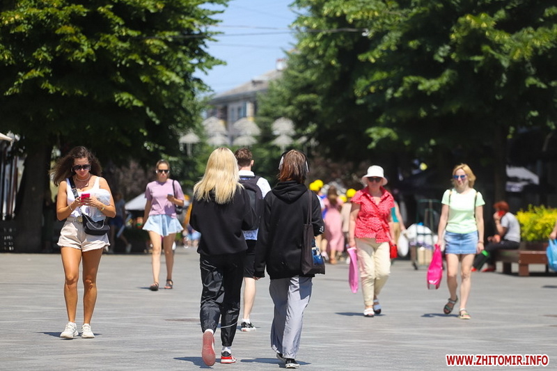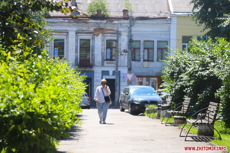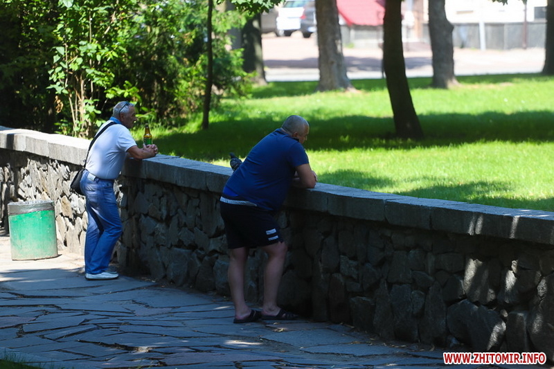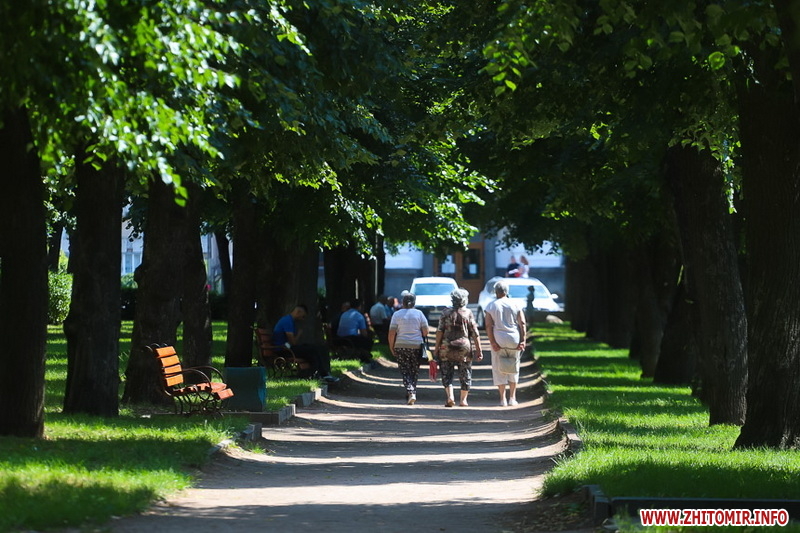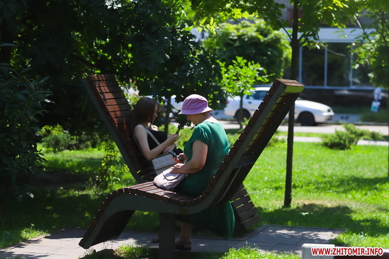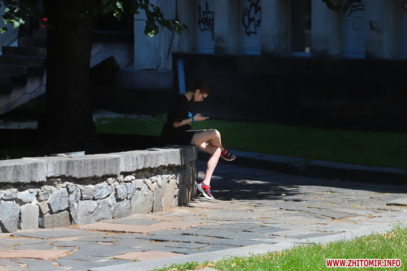 Літо у розпалі - опівдні 4 липня у Житомирі стовпчики термометрів у тіні сягнули 28-29 градусів тепла. Люди та тварини на вулицях міста намагаються сховатися від прямих сонячних променів у затінку дерев. У міських скверах та парках усі лавки на сонці порожні, а у затінку люди відпочивають навіть на парапетах.