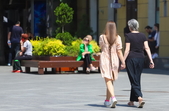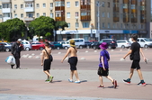 Діти знаходять прохолоду у фонтанах і залюбки бавляться з водою. Багато хто гуляє вулицями з прохолодними напоями у руках, але головний убір одягають одиниці, переважно люди старшого віку і діти.