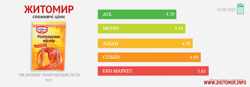 Моніторинг здійснено на основі інформації, отриманої за методом контрольної закупки 23.06.2023 р. у місцях продажу: АТБ, пр. Миру, 15 А, Ашан, вул. Київська, 77, Метро, вул. Ватутіна, 55-в, Сільпо, пл. Житній ринок, 1, Еко Маркет, вул. Мала Бердичівська, 2/7