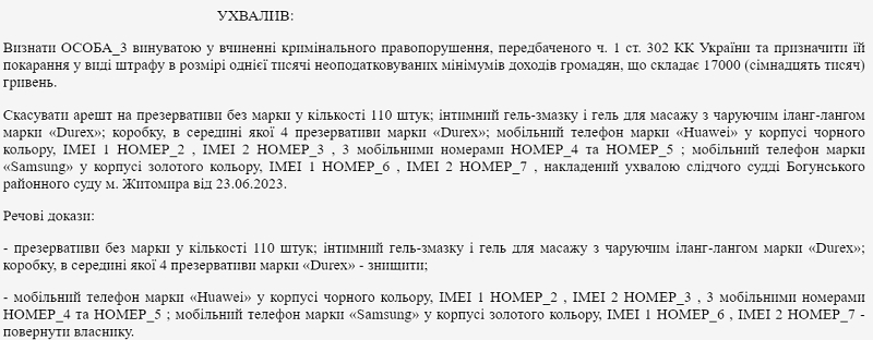Врешті, суд ухвалив: «визнати ОСОБА_3 винуватою у вчиненні кримінального правопорушення, передбаченого ч. 1 ст. 302 КК України, та призначити їй покарання у виді штрафу в розмірі однієї тисячі неоподатковуваних мінімумів доходів громадян, що складає 17000 (сімнадцять тисяч) гривень».