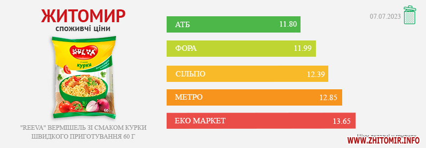 Моніторинг здійснено на основі інформації, отриманої за методом контрольної закупки 07.07.2023 р. у місцях продажу: АТБ, пр. Миру, 15 А, Фора, вул. Лятошинського, 2, Метро, вул. Ватутіна, 55-в, Сільпо, пл. Житній ринок, 1, Еко Маркет, вул. М. Бердичівська, 2/7