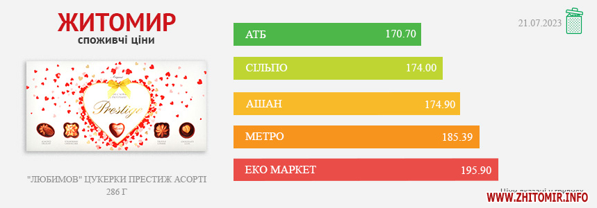 Моніторинг здійснено на основі інформації, отриманої за методом контрольної закупки 21.07.2023 р. у місцях продажу: АТБ, пр. Миру, 15 А, Ашан, вул. Київська, 77, Метро, вул. Ватутіна, 55-в, Сільпо, пл. Житній ринок, 1, Еко Маркет, вул. М. Бердичівська, 2/7