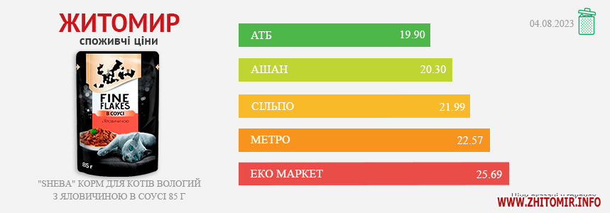 Моніторинг здійснено на основі інформації, отриманої за методом контрольної закупки 21.07.2023 р. у місцях продажу: АТБ, пр. Миру, 15 А, Ашан, вул. Київська, 77, Метро, вул. Ватутіна, 55-в, Сільпо, пл. Житній ринок, 1, Екомаркет, вул. М. Бердичівська, 2/7