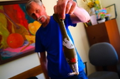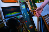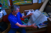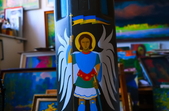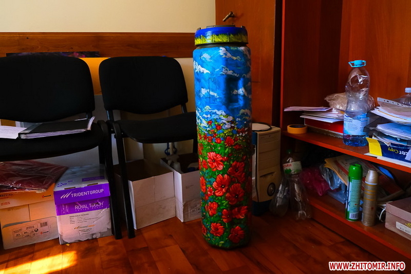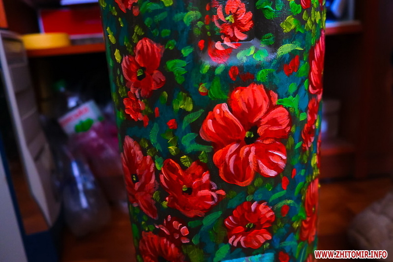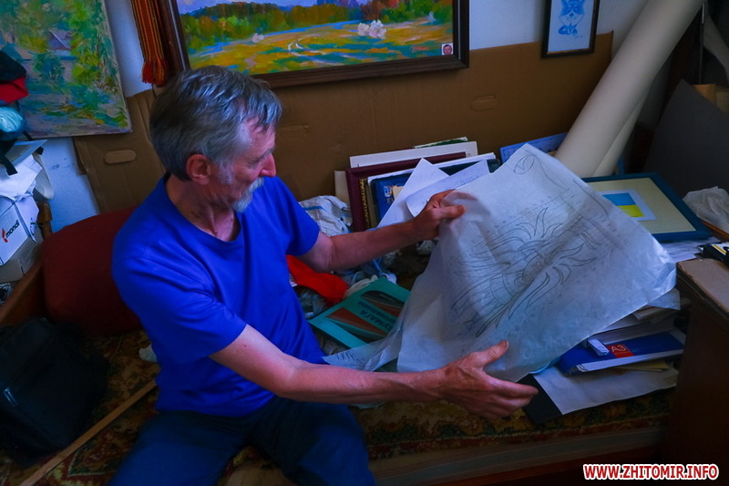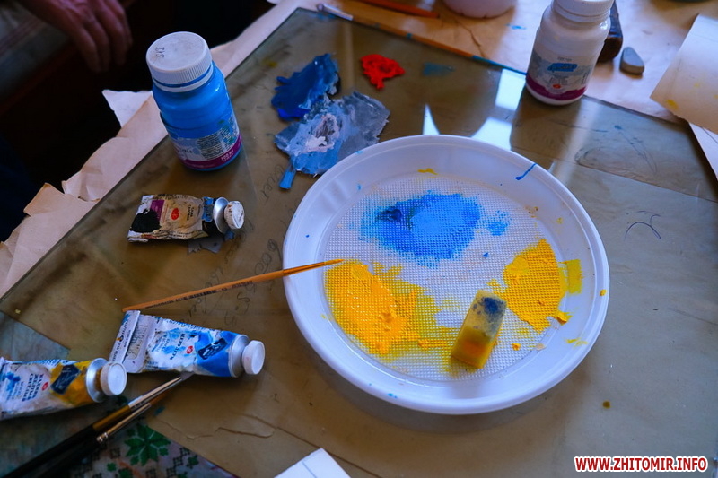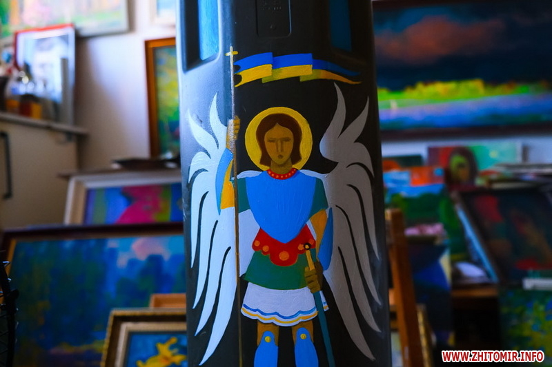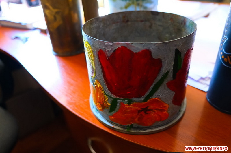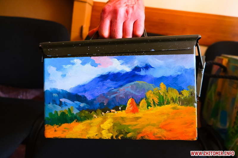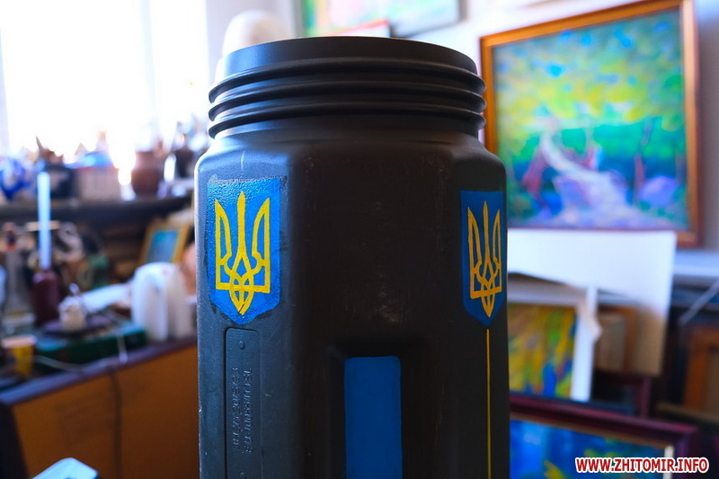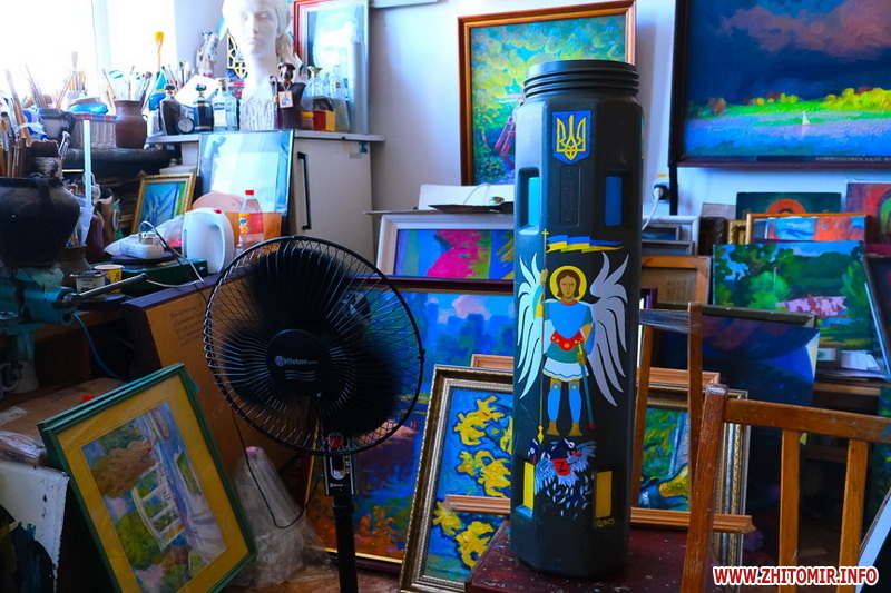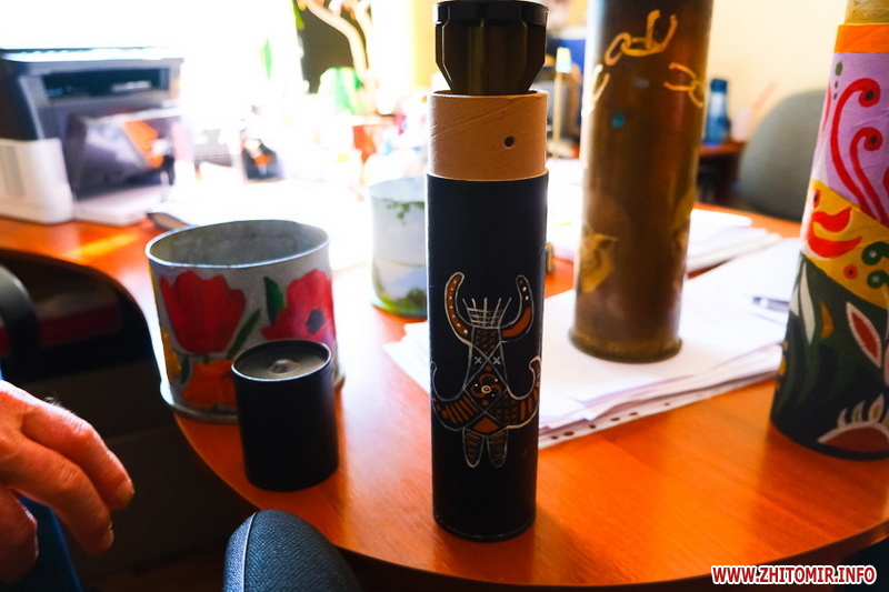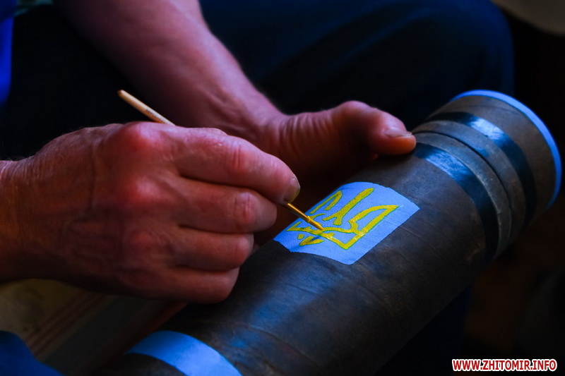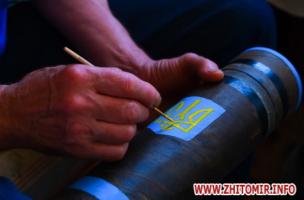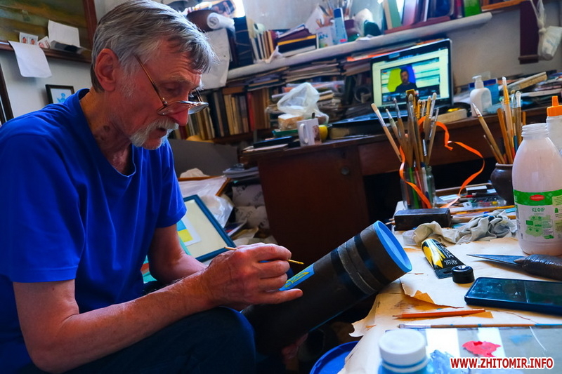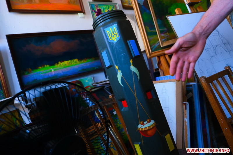 “Сьогодні для всіх нас важливо допомагати ЗСУ, відстоювати інтереси України. Якщо наші воїни не відстоять нашу землю, нам тікати з неї нема куди. Мої два старші сини служать, але мене вже не взяли, сказали, що я старий. Тому я намагаюся робити все, що в моїх силах. Ми всі маємо допомагати. Наша спілка художників допомагає з 2014 року - ми збираємо кошти, влаштовуємо аукціони, тож коли отримали пропозицію від краєзнавчого музею підготували лоти на благодійний аукціон, то вирішили долучитися”, - розповідає голова Житомирської обласної організації Національної спілки художників України, художник Василь Кондратюк, розписуючи черговий тубус.