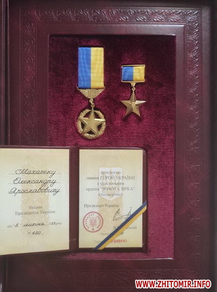«Державна нагорода, на жаль, посмертно… Звання «Герой України» сьогодні вручив родині Захисника, який повернувся на щиті, Президент України Володимир Зеленський. Полковник Махачек Олександр Ярославович, 15.07.1972 року народження. Офіцер Управління інженерних військ Командування Сил підтримки ЗСУ, кавалер ордена Богдана Хмельницького. Загинув при виконанні бойових завдань 30.05.2022, під час ворожого артилерійського обстрілу у районі траси Лисичанськ-Бахмут... Похований на Смолянському військовому цвинтарі у Житомирі», - йдеться в повідомленні.
