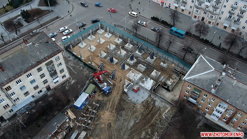 В центрі Житомира, на розі вулиць Київської та Театральної, за кілька місяців після початку повномасштабного російського вторгнення відновили будівництво, і станом на вересень 2023 року там вже зведена велика чотириповерхова будівля.