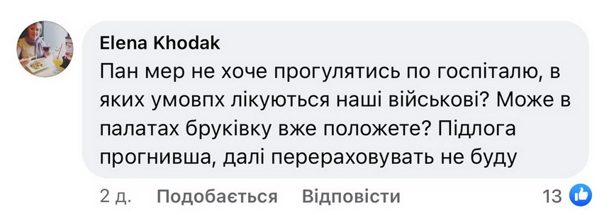 «Госпіталь належить Міністерству оборони, і ми, на жаль, навіть якщо хочемо, то не можемо закрити всі потреби Міністерства оборони. В наших лікарнях також лікуються і лікувалися хлопці після поранень, і нам треба за рахунок свого бюджету давати їм нормальні умови, робити розширення відділень, купувати нове обладнання. В нас було декілька звернень від госпіталю, по всім цим зверненням ми надали субвенцію (з міського бюджету): на одній сесії надали 2 млн грн, на останній сесії, яка була 30 серпня, ще 3 млн грн. І ще була сума приблизно 1 млн грн саме на обладнання: обговорювали з начальником шпиталю Серебряковим саме обладнання, яке допомагає відновленню кінцівок», - розповів Сергій Сухомлин.