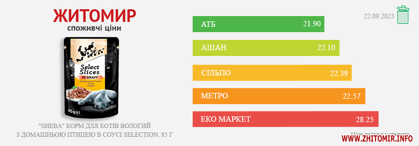 Моніторинг здійснено на основі інформації, отриманої за методом контрольної закупки 22.09.2023 р. у місцях продажу: АТБ, пр. Миру, 15 А, Ашан, вул. Київська, 77, Метро, вул. Ватутіна, 55-в, Сільпо, пл. Житній ринок, 1, Еко Маркет, вул. М. Бердичівська, 2/7