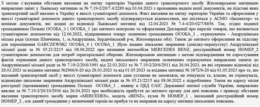 «Згідно поданої громадянином Польщі ОСОБА_3 до митного контролю та оформлення Декларації про перелік товарів, що визнаються гуманітарною допомогою від 12.06.2022, відправником товару зазначено громадянина ОСОБА_3, отримувачем – Андрушівська міська рада (площа Шевченка, 1, м.Андрушівка, Бердичівський р-н, Житомирська обл.). Також до митного оформлення як підставу для переміщення було надано письмове звернення (довідку-перепустку) Андрушівської міської ради за № 05.21/2215 від 08.06.2022 про визнання автомобіля MERCEDES BENZ, реєстраційний номер НОМЕР_2 гуманітарною допомогою для потреб територіальної оборони», - йдеться у матеріалах суду.