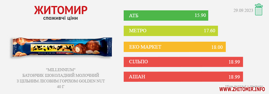Моніторинг здійснено на основі інформації, отриманої за методом контрольної закупки 29.09.2023 р. у місцях продажу: АТБ, пр. Миру, 15 А, Ашан, вул. Київська, 77, Метро, вул. Ватутіна, 55-в, Сільпо, пл. Житній ринок, 1, Еко Маркет, вул. М. Бердичівська, 2/7