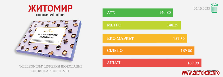 Моніторинг здійснено на основі інформації, отриманої за методом контрольної закупки 06.10.2023 р. у місцях продажу: АТБ, пр. Миру, 15 А, Ашан, вул. Київська, 77, Метро, вул. Ватутіна, 55-в, Сільпо, пл. Житній ринок, 1, Еко Маркет, вул. М. Бердичівська, 2/7