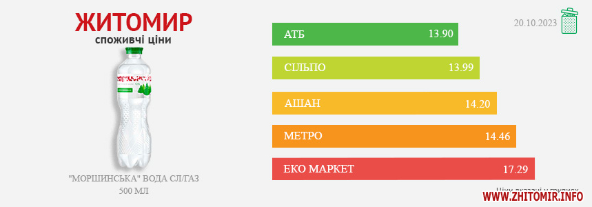 Моніторинг здійснено на основі інформації, отриманої за методом контрольної закупки 20.10.2023 р. у місцях продажу: АТБ, пр. Миру, 15 А, Ашан, вул. Київська, 77 , Метро, вул. Ватутіна, 55-в, Сільпо, пл. Житній ринок, 1, Еко Маркет, вул. М. Бердичівська, 2/7