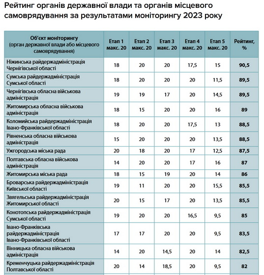 Моніторинг охопив 141 розпорядника публічної інформації – обласні та районні адміністрації і міські ради столиці та обласних центрів. 1 місце у Ніжинської РДА Чернігівської області (90,5%), 4 місце – Житомирська ОВА (89%), 9 місце – Житомирська міська рада (86%). Також у моніторингу є й інші представники Житомирської області: Звягельська РДА (85,5%), Коростенська РДА (74,5%), Бердичівська РДА (64,5%), Житомирська РДА (59%).